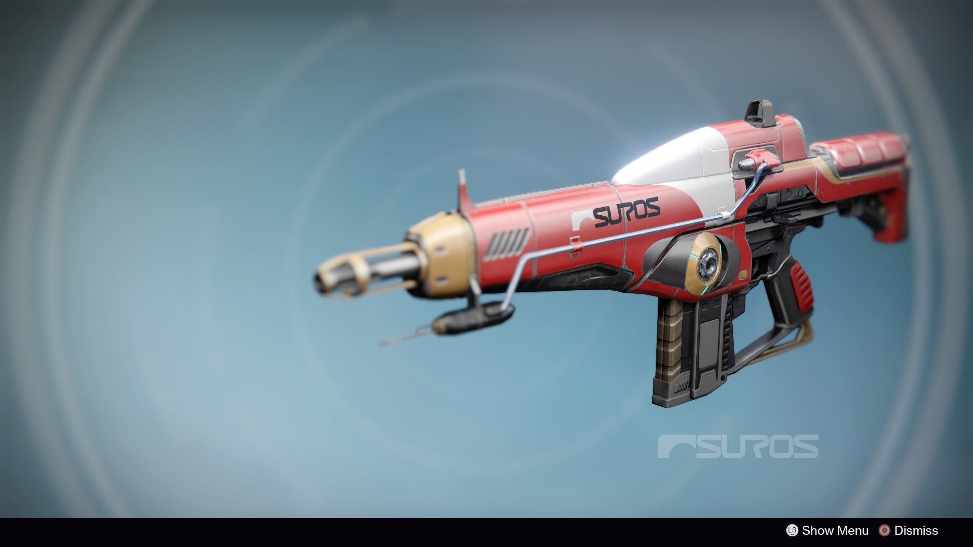 This image is a screenshot of a weapon from the Destiny series of first-person shooter video games developed by Bungie Studios and published by Bungie or Activision. It falls under the screenshot category for a copyrighted computer game or video game, and the copyright for it is most likely held by the company that developed the game. It is believed that the use of a limited number of web-resolution screenshots: