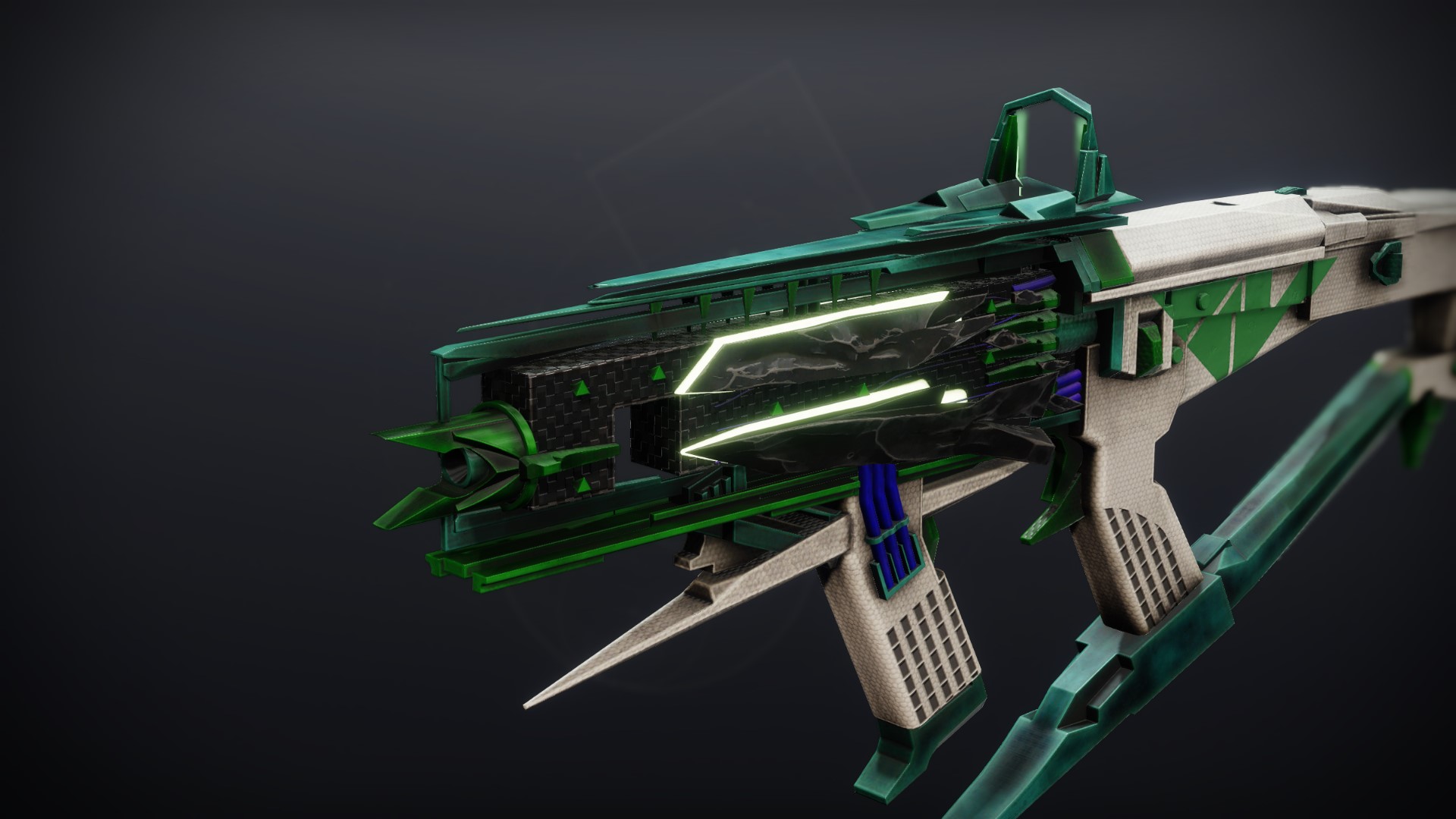 This image is a screenshot of a weapon from the Destiny series of first-person shooter video games developed by Bungie Studios and published by Bungie or Activision. It falls under the screenshot category for a copyrighted computer game or video game, and the copyright for it is most likely held by the company that developed the game. It is believed that the use of a limited number of web-resolution screenshots:
