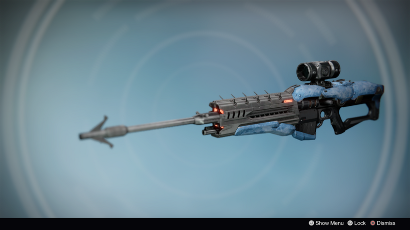 This image is a screenshot of a weapon from the Destiny series of first-person shooter video games developed by Bungie Studios and published by Bungie or Activision. It falls under the screenshot category for a copyrighted computer game or video game, and the copyright for it is most likely held by the company that developed the game. It is believed that the use of a limited number of web-resolution screenshots: