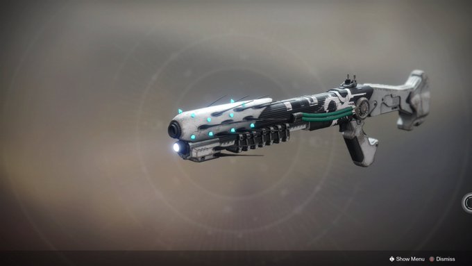 This image is a screenshot of a weapon from the Destiny series of first-person shooter video games developed by Bungie Studios and published by Bungie or Activision. It falls under the screenshot category for a copyrighted computer game or video game, and the copyright for it is most likely held by the company that developed the game. It is believed that the use of a limited number of web-resolution screenshots: