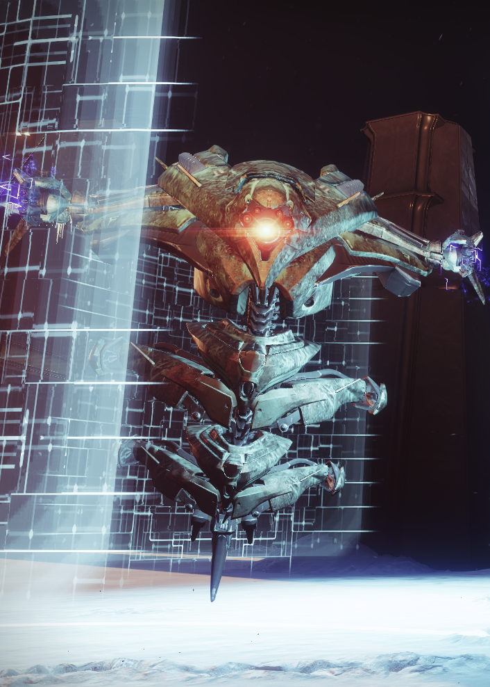 This image is a screenshot of a character or AI unit from the Destiny series of first-person shooter video games developed by Bungie Studios and published by Bungie or Activision. It falls under the screenshot category for a copyrighted computer game or video game, and the copyright for it is most likely held by the company that developed the game. It is believed that the use of a limited number of web-resolution screenshots: