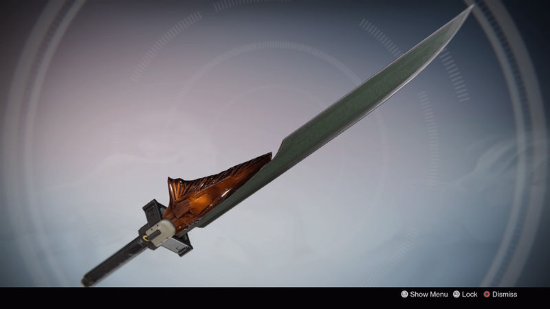This image is a screenshot of a weapon from the Destiny series of first-person shooter video games developed by Bungie Studios and published by Bungie or Activision. It falls under the screenshot category for a copyrighted computer game or video game, and the copyright for it is most likely held by the company that developed the game. It is believed that the use of a limited number of web-resolution screenshots: