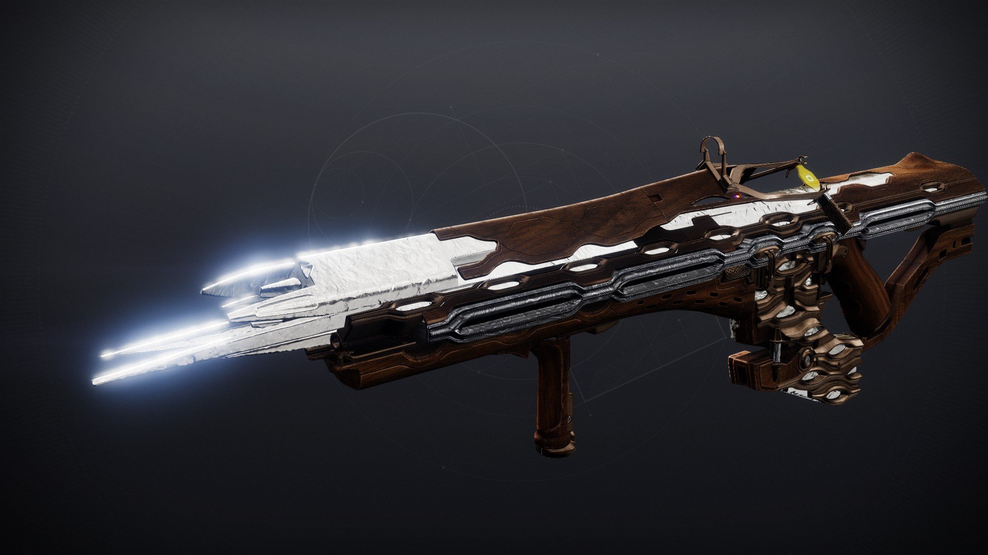 This image is a screenshot of a weapon from the Destiny series of first-person shooter video games developed by Bungie Studios and published by Bungie or Activision. It falls under the screenshot category for a copyrighted computer game or video game, and the copyright for it is most likely held by the company that developed the game. It is believed that the use of a limited number of web-resolution screenshots: