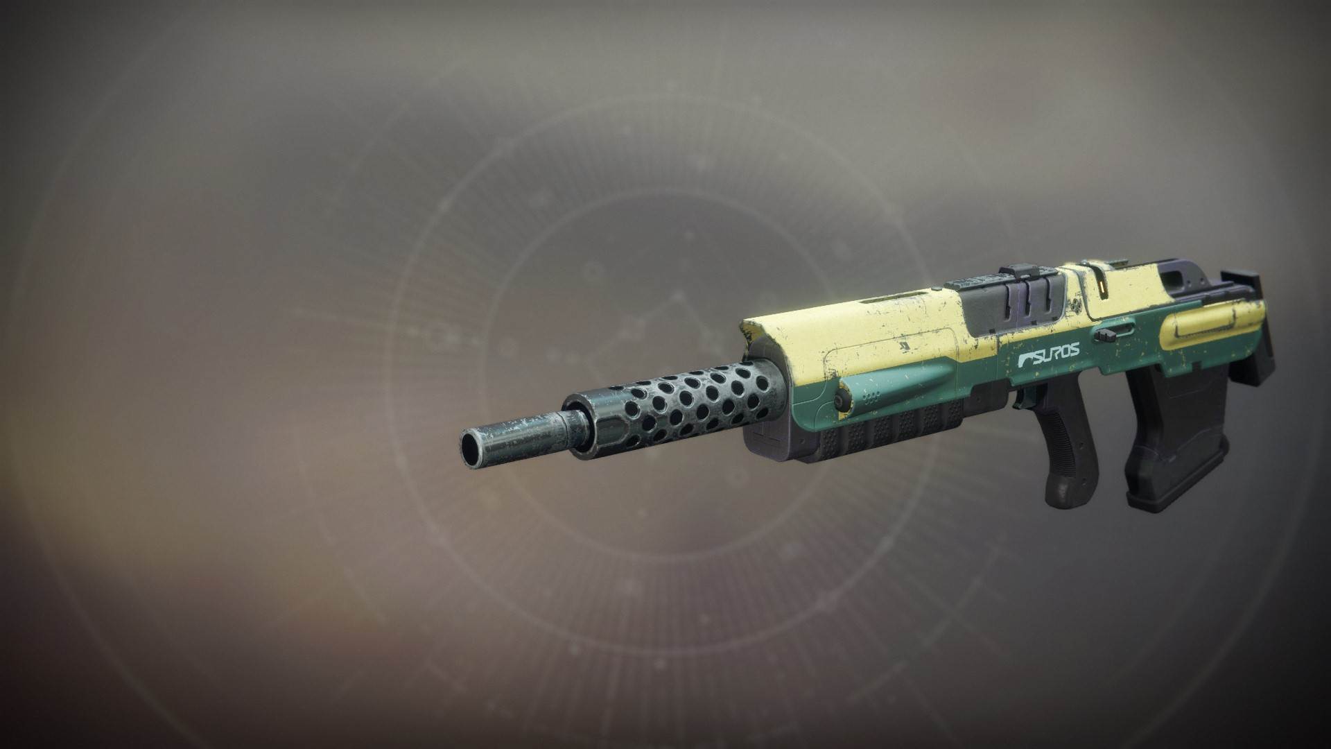 This image is a screenshot of a weapon from the Destiny series of first-person shooter video games developed by Bungie Studios and published by Bungie or Activision. It falls under the screenshot category for a copyrighted computer game or video game, and the copyright for it is most likely held by the company that developed the game. It is believed that the use of a limited number of web-resolution screenshots: