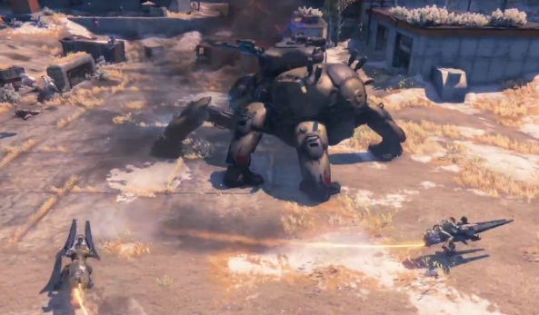 A pair of Guardians circling around a Devil Walker on their Sparrows.