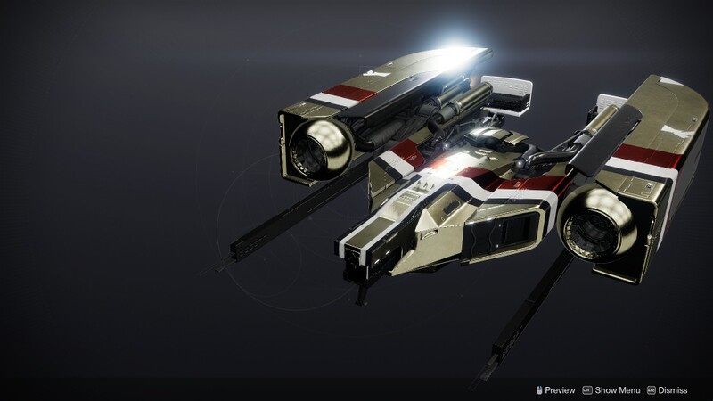 This image is a screenshot of a vehicle from the Destiny series of first-person shooter video games developed by Bungie Studios and published by Bungie or Activision. It falls under the screenshot category for a copyrighted computer game or video game, and the copyright for it is most likely held by the company that developed the game. It is believed that the use of a limited number of web-resolution screenshots: