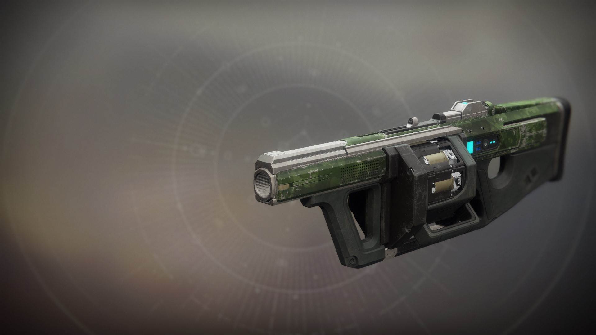 This image is a screenshot of a weapon from the Destiny series of first-person shooter video games developed by Bungie Studios and published by Bungie or Activision. It falls under the screenshot category for a copyrighted computer game or video game, and the copyright for it is most likely held by the company that developed the game. It is believed that the use of a limited number of web-resolution screenshots: