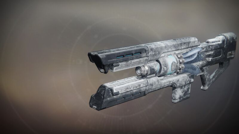 This image is a screenshot of a weapon from the Destiny series of first-person shooter video games developed by Bungie Studios and published by Bungie or Activision. It falls under the screenshot category for a copyrighted computer game or video game, and the copyright for it is most likely held by the company that developed the game. It is believed that the use of a limited number of web-resolution screenshots: