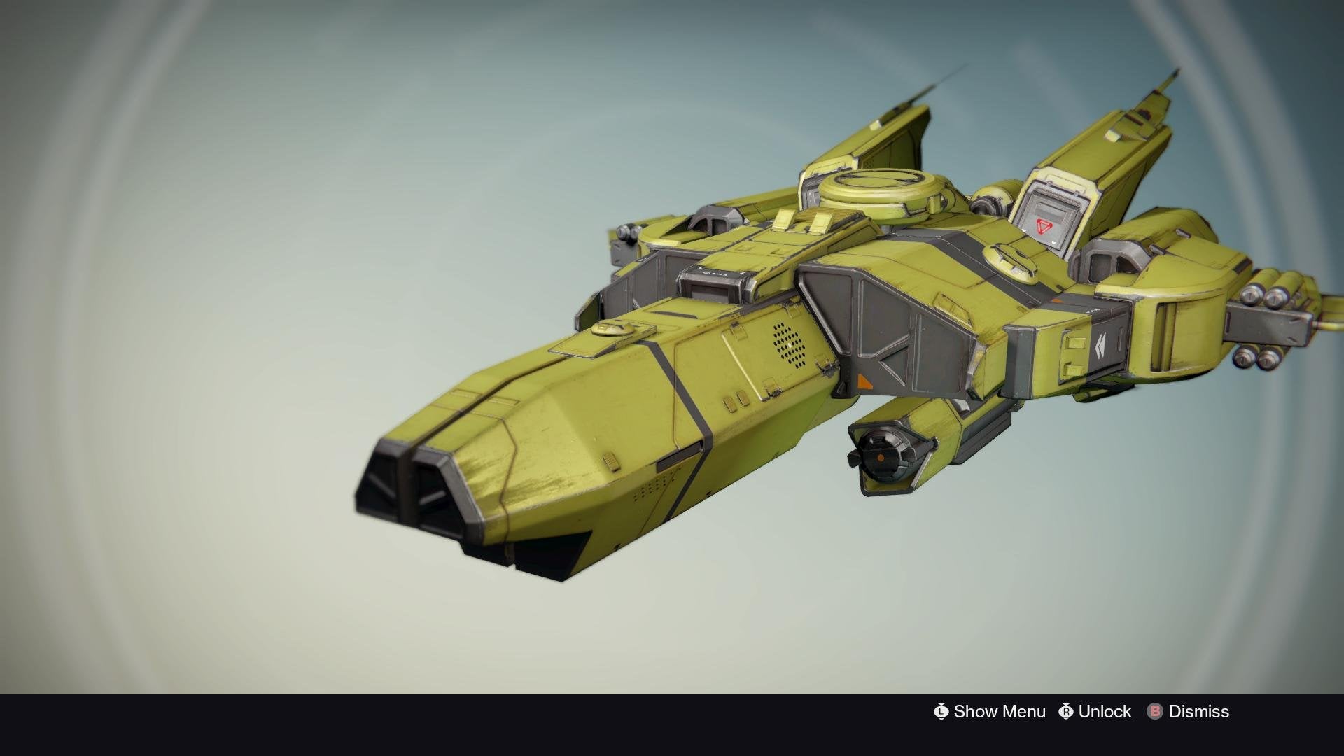 This image is a screenshot of a vehicle from the Destiny series of first-person shooter video games developed by Bungie Studios and published by Bungie or Activision. It falls under the screenshot category for a copyrighted computer game or video game, and the copyright for it is most likely held by the company that developed the game. It is believed that the use of a limited number of web-resolution screenshots: