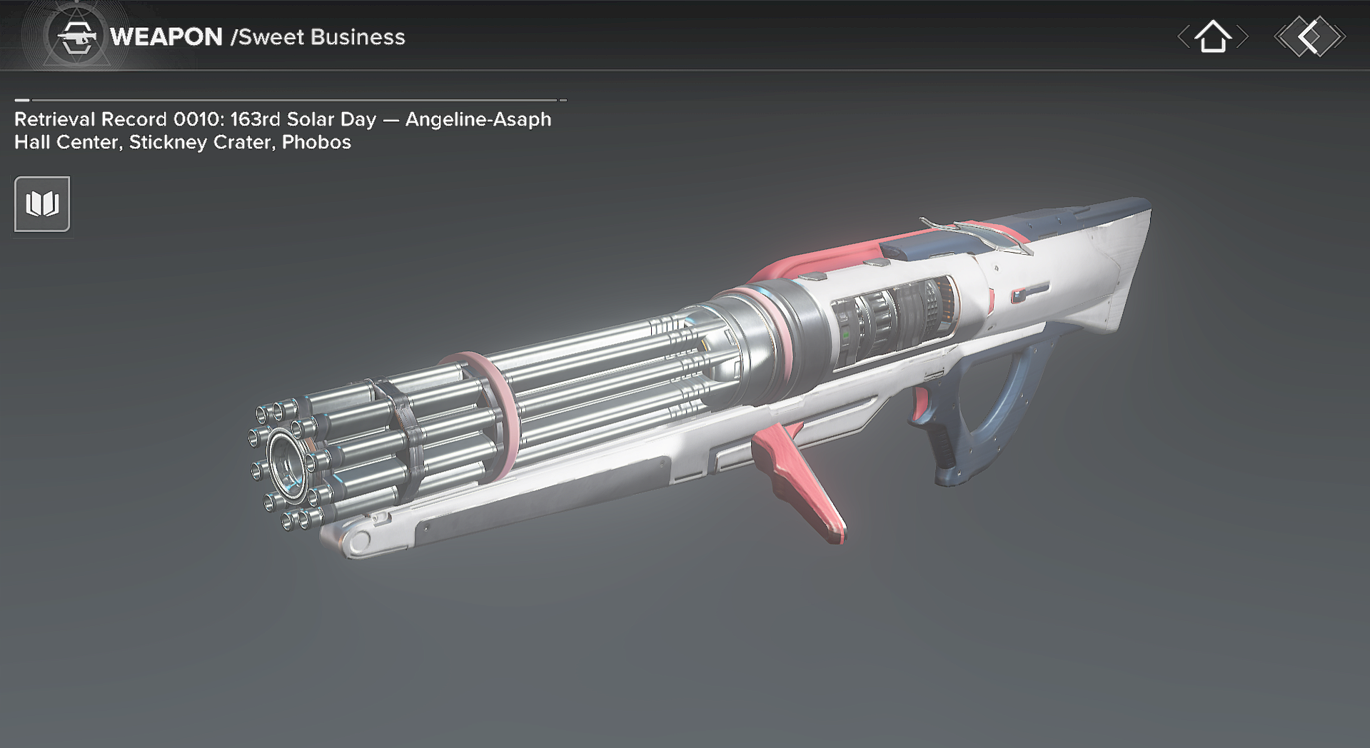 This image is a screenshot of a weapon from the Destiny series of first-person shooter video games developed by Bungie Studios and published by Bungie or Activision. It falls under the screenshot category for a copyrighted computer game or video game, and the copyright for it is most likely held by the company that developed the game. It is believed that the use of a limited number of web-resolution screenshots:
