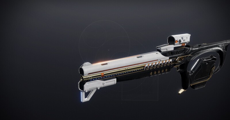 This image is a screenshot of a weapon from the Destiny series of first-person shooter video games developed by Bungie Studios and published by Bungie or Activision. It falls under the screenshot category for a copyrighted computer game or video game, and the copyright for it is most likely held by the company that developed the game. It is believed that the use of a limited number of web-resolution screenshots: