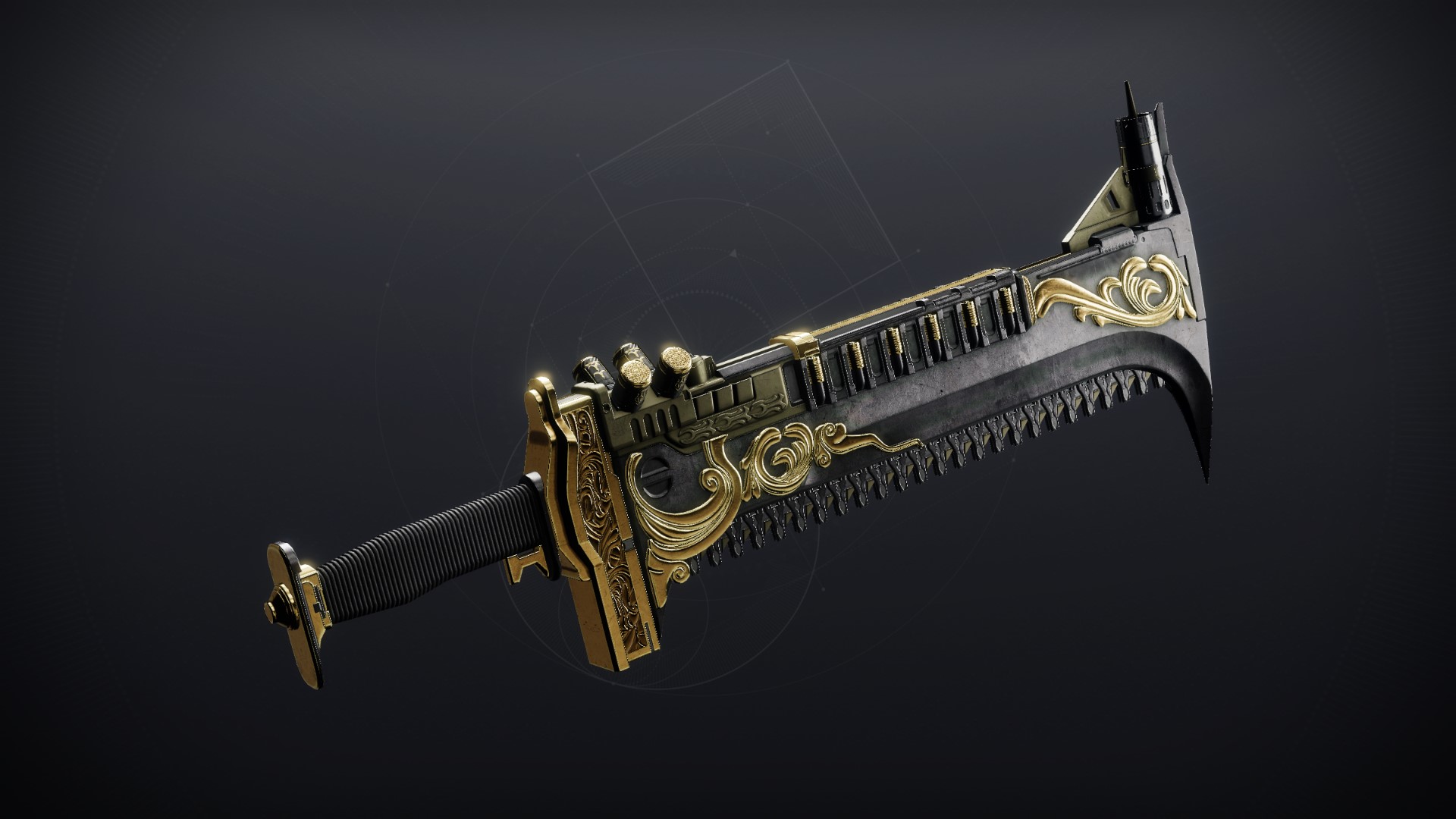 This image is a screenshot of a weapon from the Destiny series of first-person shooter video games developed by Bungie Studios and published by Bungie or Activision. It falls under the screenshot category for a copyrighted computer game or video game, and the copyright for it is most likely held by the company that developed the game. It is believed that the use of a limited number of web-resolution screenshots: