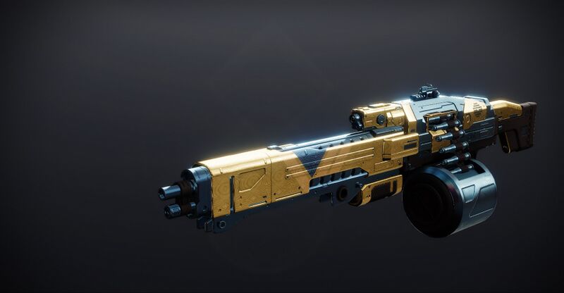 This image is a screenshot of a weapon from the Destiny series of first-person shooter video games developed by Bungie Studios and published by Bungie or Activision. It falls under the screenshot category for a copyrighted computer game or video game, and the copyright for it is most likely held by the company that developed the game. It is believed that the use of a limited number of web-resolution screenshots: