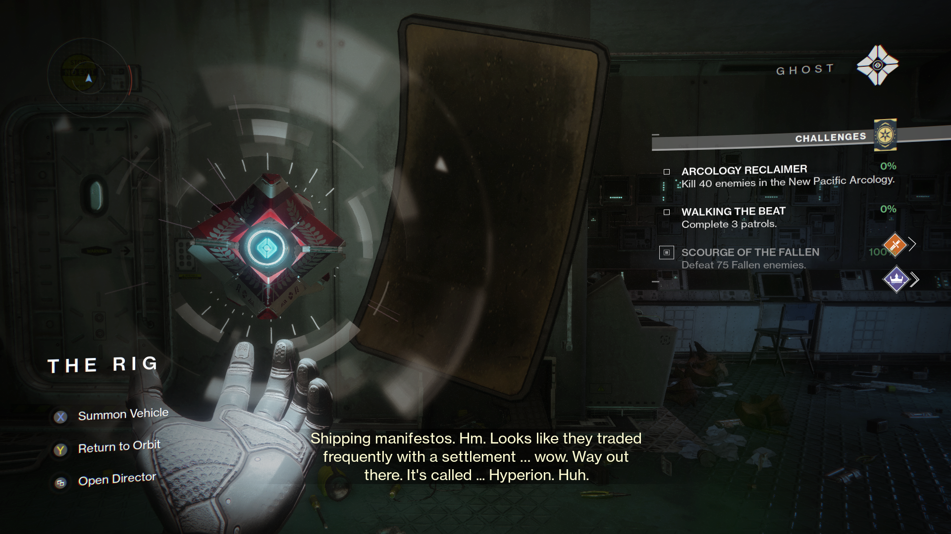 Ghost: "Shipping manifest. Hm. Looks like they traded frequently with a settlement... wow. Way out there. It's called... Hyperion. Huh."