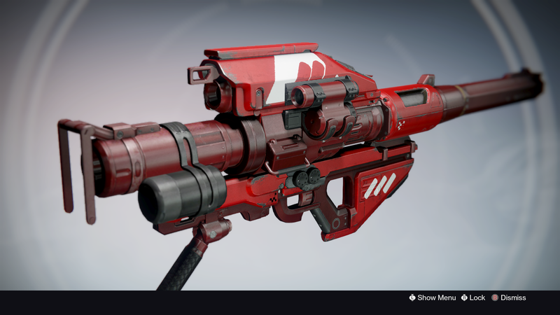 This image is a screenshot of a weapon from the Destiny series of first-person shooter video games developed by Bungie Studios and published by Bungie or Activision. It falls under the screenshot category for a copyrighted computer game or video game, and the copyright for it is most likely held by the company that developed the game. It is believed that the use of a limited number of web-resolution screenshots: