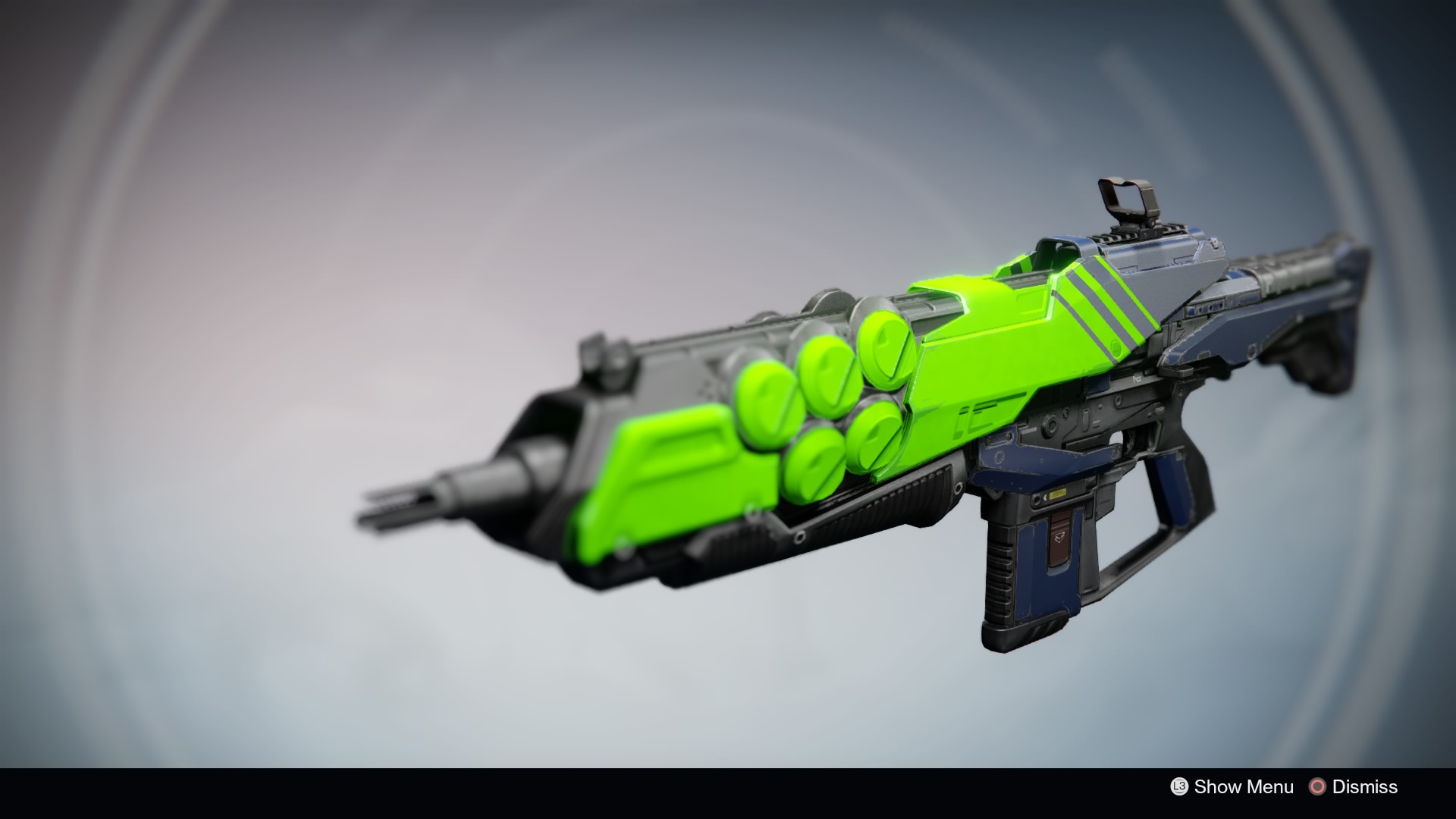 This image is a screenshot of a weapon from the Destiny series of first-person shooter video games developed by Bungie Studios and published by Bungie or Activision. It falls under the screenshot category for a copyrighted computer game or video game, and the copyright for it is most likely held by the company that developed the game. It is believed that the use of a limited number of web-resolution screenshots: