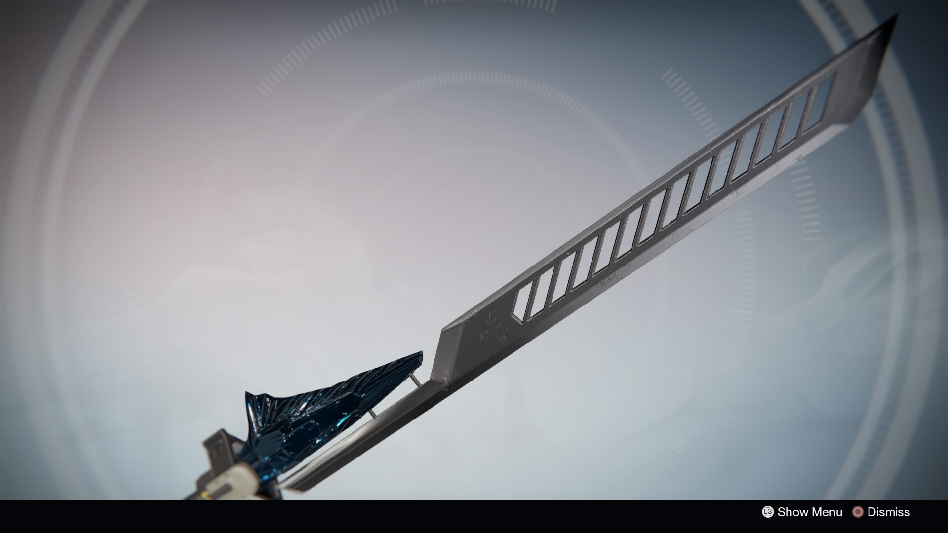 This image is a screenshot of a weapon from the Destiny series of first-person shooter video games developed by Bungie Studios and published by Bungie or Activision. It falls under the screenshot category for a copyrighted computer game or video game, and the copyright for it is most likely held by the company that developed the game. It is believed that the use of a limited number of web-resolution screenshots: