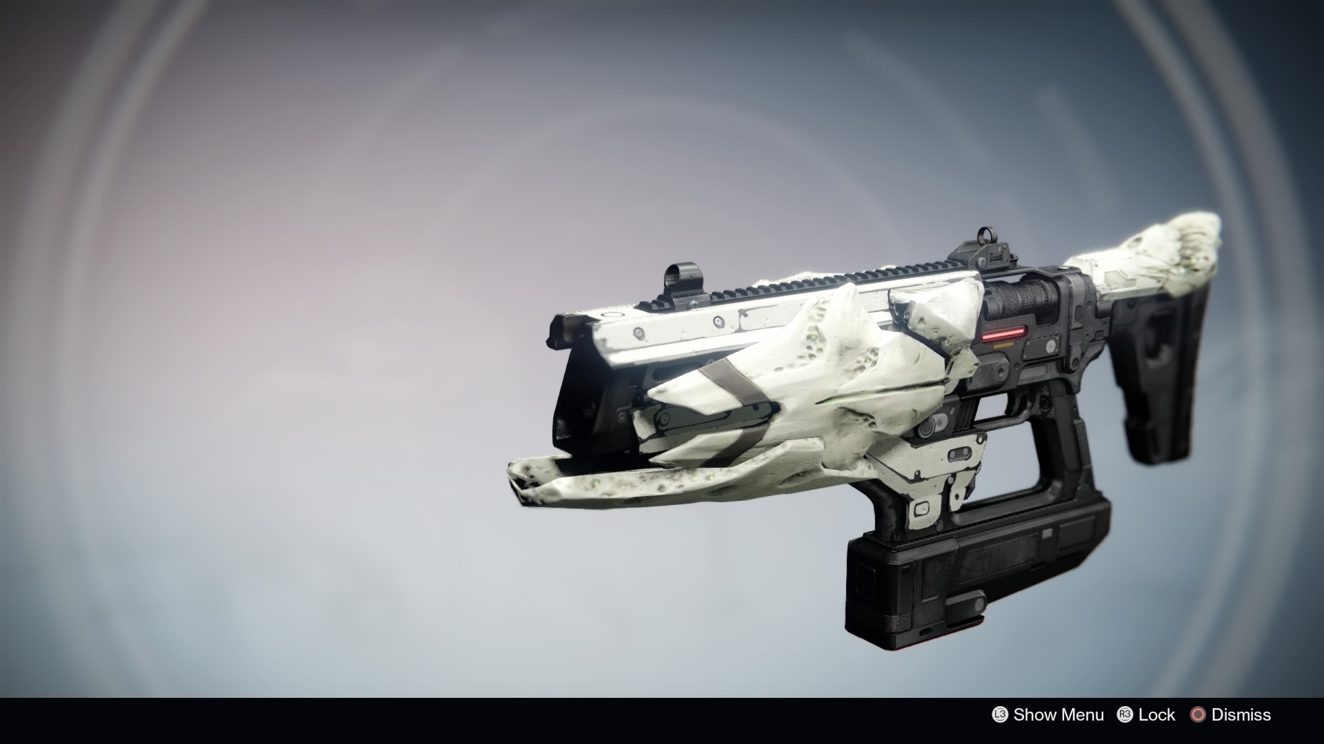 This image is a screenshot of a weapon from the Destiny series of first-person shooter video games developed by Bungie Studios and published by Bungie or Activision. It falls under the screenshot category for a copyrighted computer game or video game, and the copyright for it is most likely held by the company that developed the game. It is believed that the use of a limited number of web-resolution screenshots: