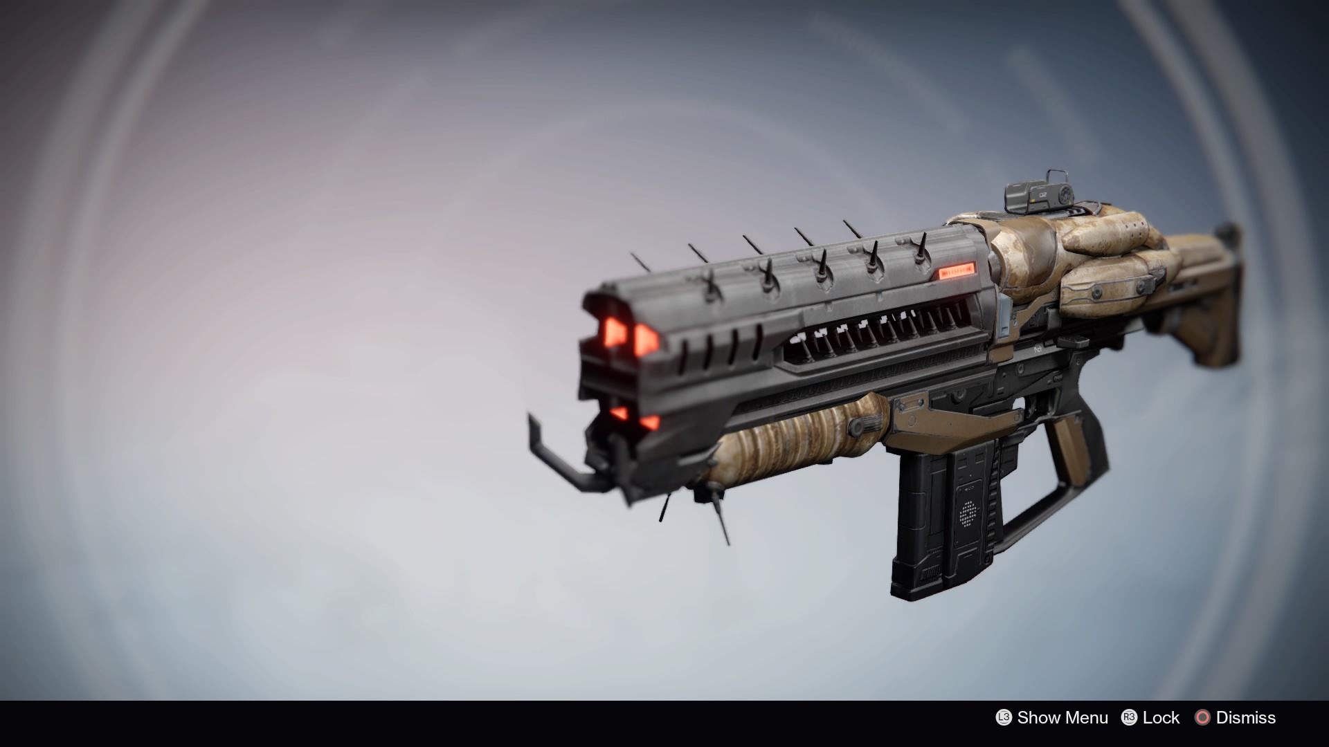 This image is a screenshot of a weapon from the Destiny series of first-person shooter video games developed by Bungie Studios and published by Bungie or Activision. It falls under the screenshot category for a copyrighted computer game or video game, and the copyright for it is most likely held by the company that developed the game. It is believed that the use of a limited number of web-resolution screenshots: