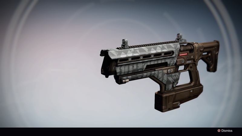 This image is a screenshot of a weapon from the Destiny series of first-person shooter video games developed by Bungie Studios and published by Bungie or Activision. It falls under the screenshot category for a copyrighted computer game or video game, and the copyright for it is most likely held by the company that developed the game. It is believed that the use of a limited number of web-resolution screenshots: