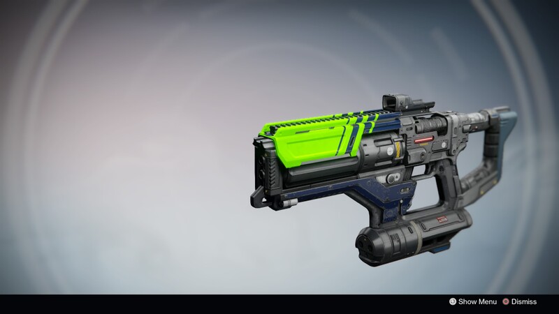This image is a screenshot of a weapon from the Destiny series of first-person shooter video games developed by Bungie Studios and published by Bungie or Activision. It falls under the screenshot category for a copyrighted computer game or video game, and the copyright for it is most likely held by the company that developed the game. It is believed that the use of a limited number of web-resolution screenshots: