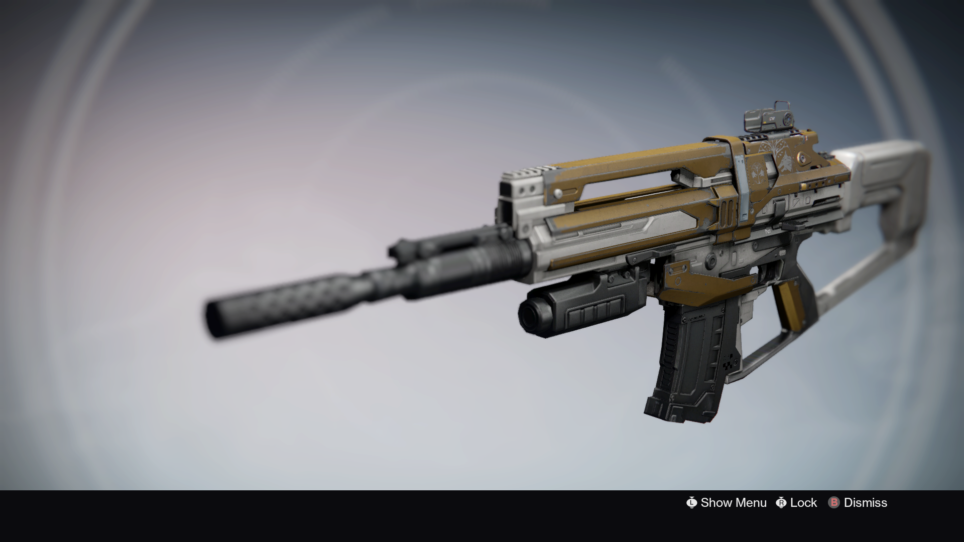 This image is a screenshot of a weapon from the Destiny series of first-person shooter video games developed by Bungie Studios and published by Bungie or Activision. It falls under the screenshot category for a copyrighted computer game or video game, and the copyright for it is most likely held by the company that developed the game. It is believed that the use of a limited number of web-resolution screenshots: