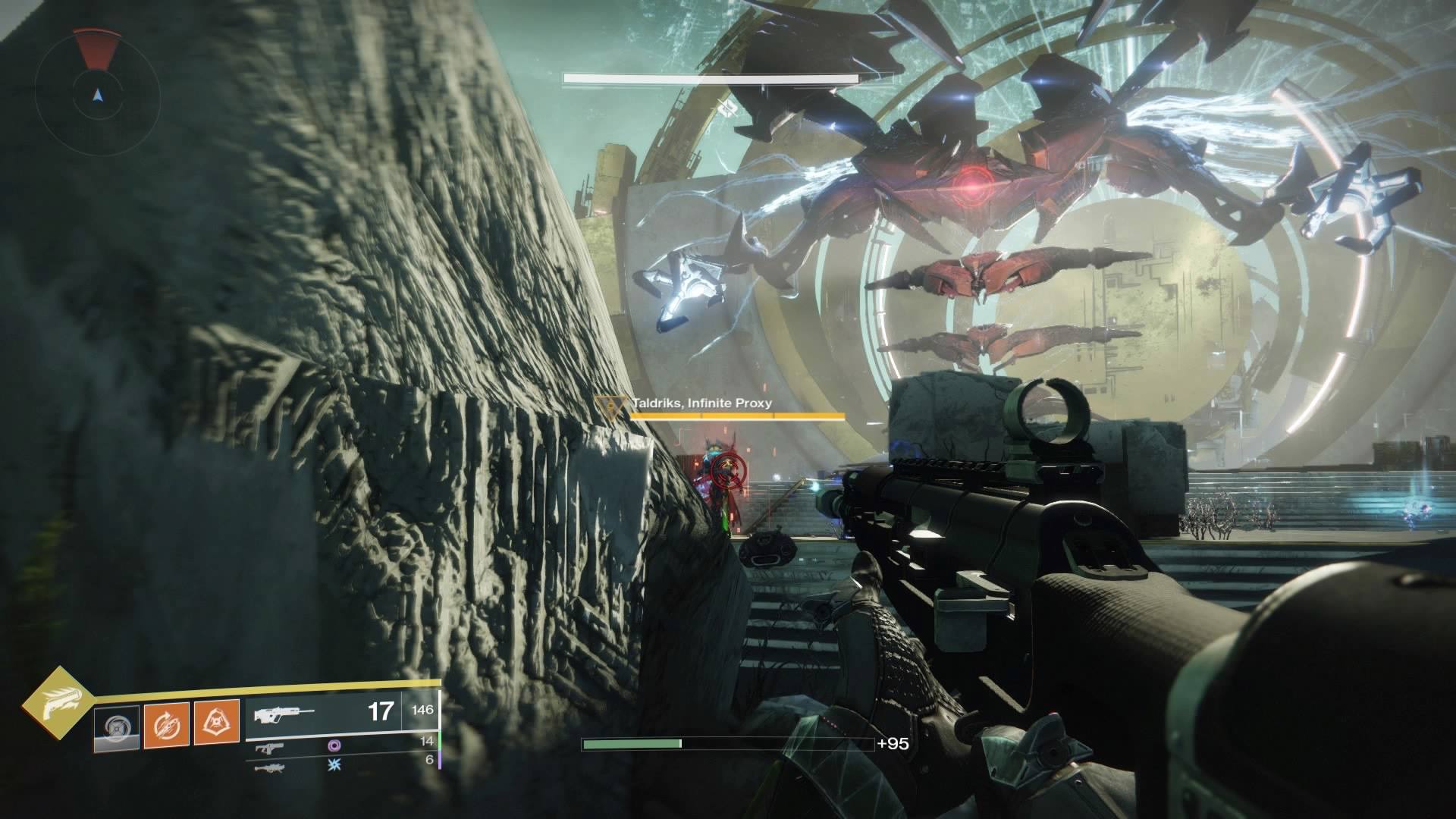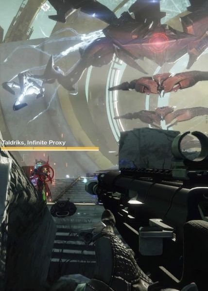 This image is a screenshot of a character or AI unit from the Destiny series of first-person shooter video games developed by Bungie Studios and published by Bungie or Activision. It falls under the screenshot category for a copyrighted computer game or video game, and the copyright for it is most likely held by the company that developed the game. It is believed that the use of a limited number of web-resolution screenshots: