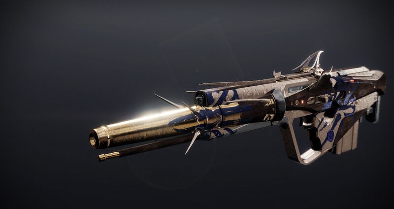 This image is a screenshot of a weapon from the Destiny series of first-person shooter video games developed by Bungie Studios and published by Bungie or Activision. It falls under the screenshot category for a copyrighted computer game or video game, and the copyright for it is most likely held by the company that developed the game. It is believed that the use of a limited number of web-resolution screenshots: