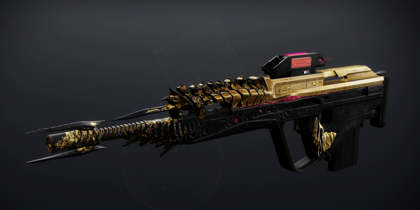 This image is a screenshot of a weapon from the Destiny series of first-person shooter video games developed by Bungie Studios and published by Bungie or Activision. It falls under the screenshot category for a copyrighted computer game or video game, and the copyright for it is most likely held by the company that developed the game. It is believed that the use of a limited number of web-resolution screenshots: