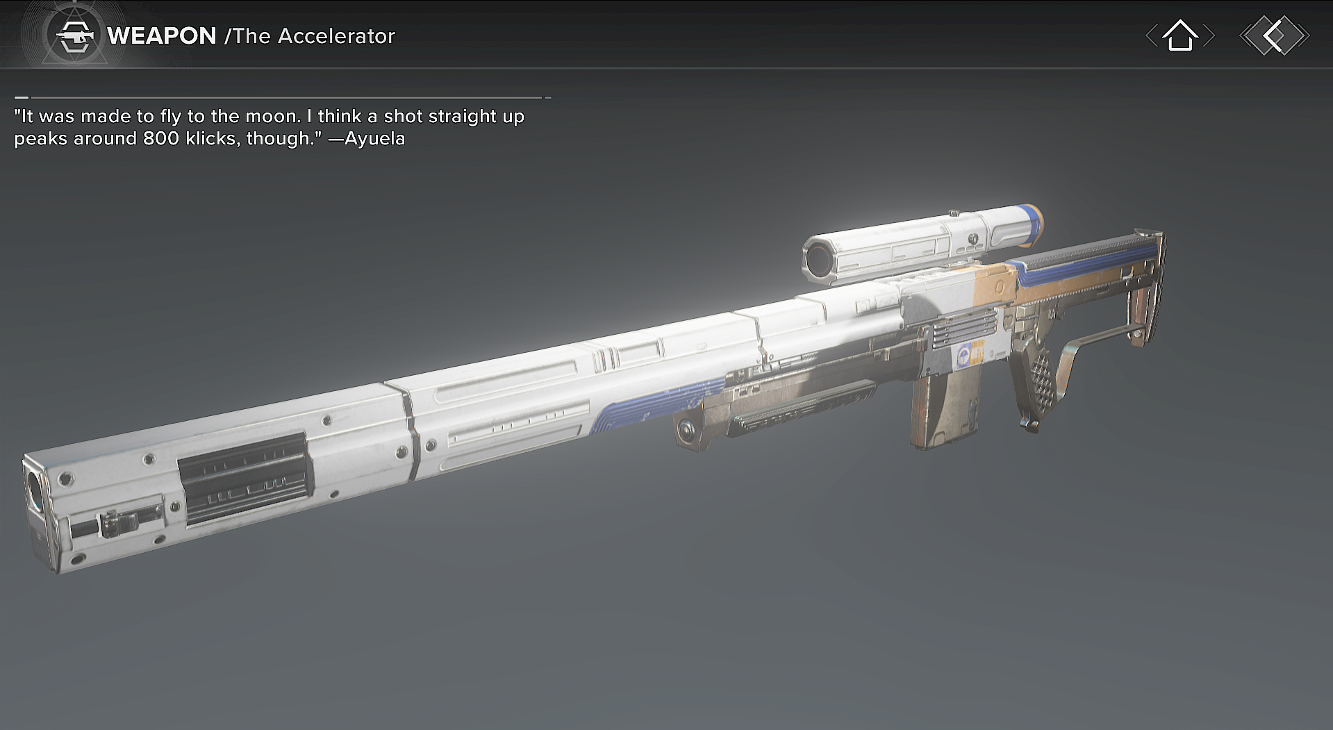 This image is a screenshot of a weapon from the Destiny series of first-person shooter video games developed by Bungie Studios and published by Bungie or Activision. It falls under the screenshot category for a copyrighted computer game or video game, and the copyright for it is most likely held by the company that developed the game. It is believed that the use of a limited number of web-resolution screenshots:
