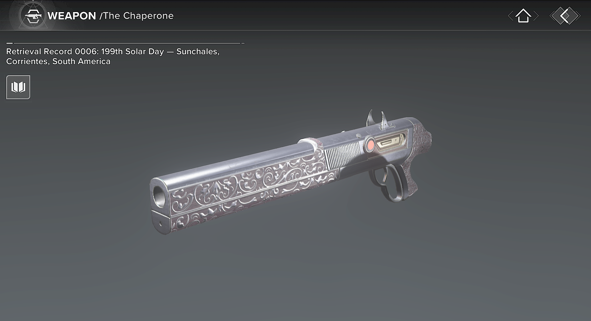 This image is a screenshot of a weapon from the Destiny series of first-person shooter video games developed by Bungie Studios and published by Bungie or Activision. It falls under the screenshot category for a copyrighted computer game or video game, and the copyright for it is most likely held by the company that developed the game. It is believed that the use of a limited number of web-resolution screenshots: