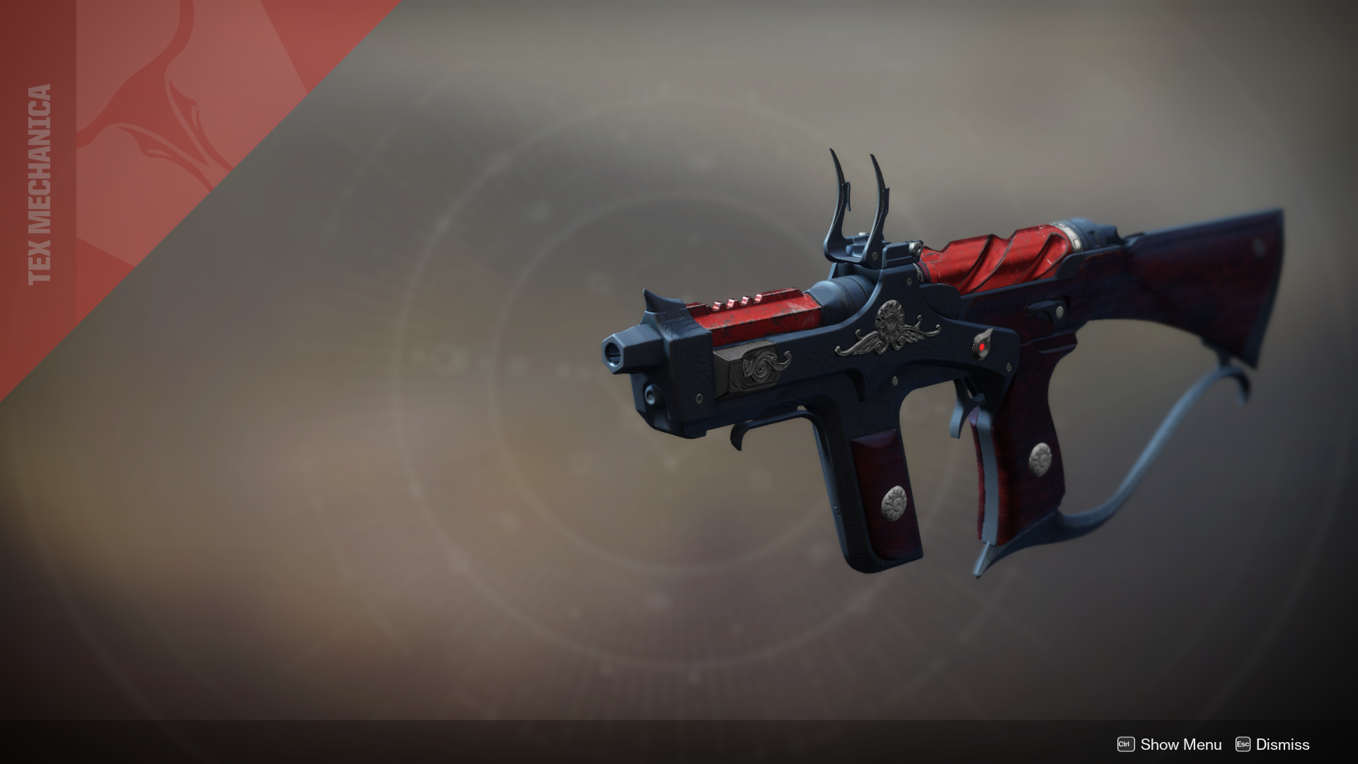 This image is a screenshot of a weapon from the Destiny series of first-person shooter video games developed by Bungie Studios and published by Bungie or Activision. It falls under the screenshot category for a copyrighted computer game or video game, and the copyright for it is most likely held by the company that developed the game. It is believed that the use of a limited number of web-resolution screenshots: