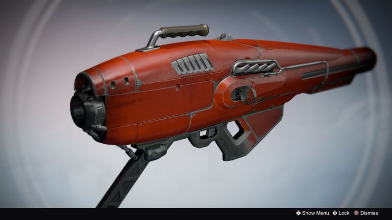 This image is a screenshot of a weapon from the Destiny series of first-person shooter video games developed by Bungie Studios and published by Bungie or Activision. It falls under the screenshot category for a copyrighted computer game or video game, and the copyright for it is most likely held by the company that developed the game. It is believed that the use of a limited number of web-resolution screenshots: