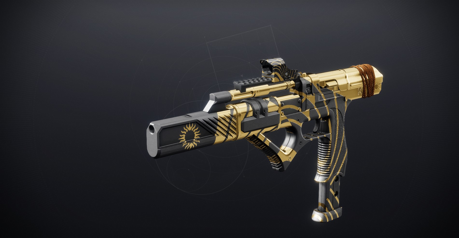 This image is a screenshot of a weapon from the Destiny series of first-person shooter video games developed by Bungie Studios and published by Bungie or Activision. It falls under the screenshot category for a copyrighted computer game or video game, and the copyright for it is most likely held by the company that developed the game. It is believed that the use of a limited number of web-resolution screenshots: