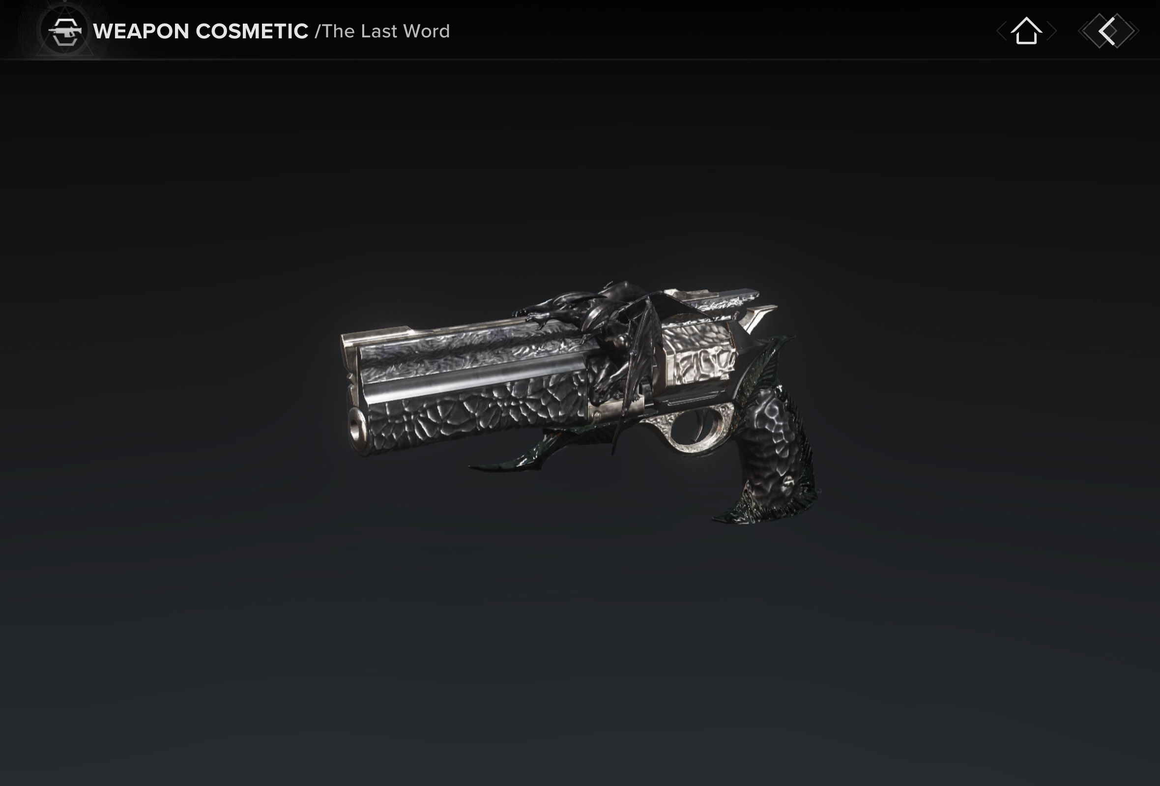 This image is a screenshot of a weapon from the Destiny series of first-person shooter video games developed by Bungie Studios and published by Bungie or Activision. It falls under the screenshot category for a copyrighted computer game or video game, and the copyright for it is most likely held by the company that developed the game. It is believed that the use of a limited number of web-resolution screenshots: