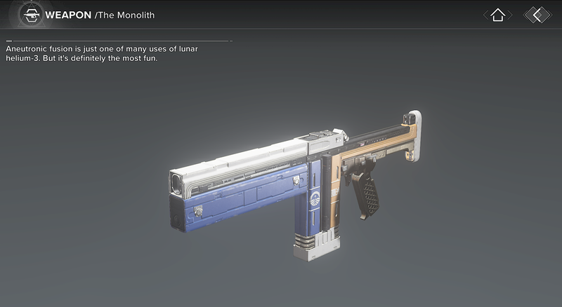 This image is a screenshot of a weapon from the Destiny series of first-person shooter video games developed by Bungie Studios and published by Bungie or Activision. It falls under the screenshot category for a copyrighted computer game or video game, and the copyright for it is most likely held by the company that developed the game. It is believed that the use of a limited number of web-resolution screenshots:
