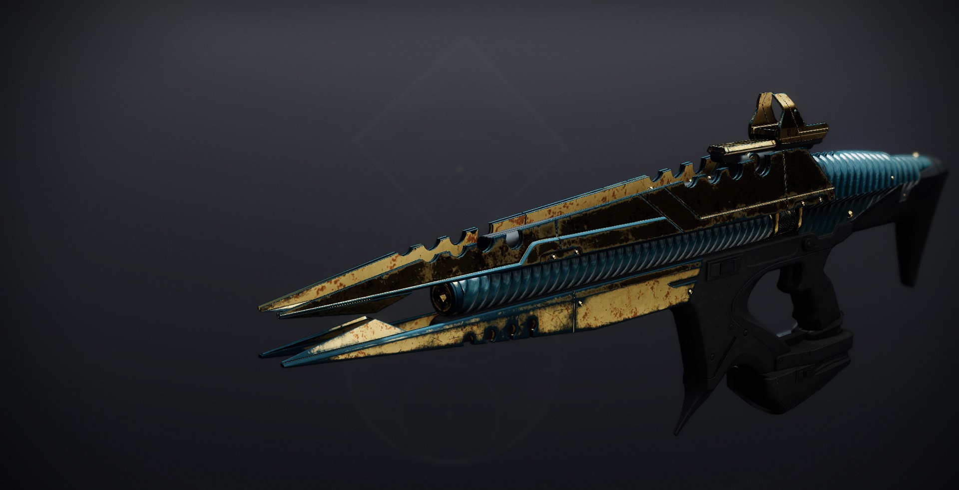 This image is a screenshot of a weapon from the Destiny series of first-person shooter video games developed by Bungie Studios and published by Bungie or Activision. It falls under the screenshot category for a copyrighted computer game or video game, and the copyright for it is most likely held by the company that developed the game. It is believed that the use of a limited number of web-resolution screenshots: