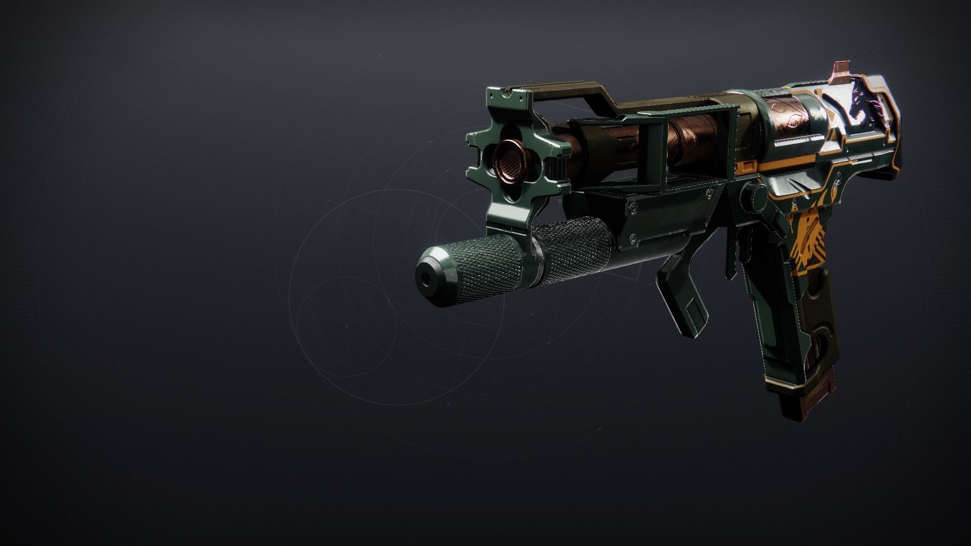 This image is a screenshot of a weapon from the Destiny series of first-person shooter video games developed by Bungie Studios and published by Bungie or Activision. It falls under the screenshot category for a copyrighted computer game or video game, and the copyright for it is most likely held by the company that developed the game. It is believed that the use of a limited number of web-resolution screenshots: