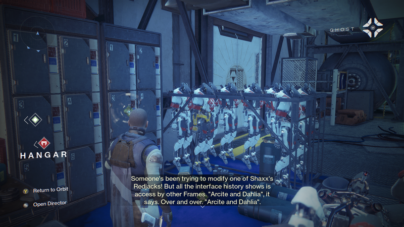 Ghost: "Someone's been trying to modify one of Shaxx's Redjacks! But all the interface history shows is access by other frames. 'Arctie and Dahlia', it says. Over and over. 'Arcite and Dahlia'."