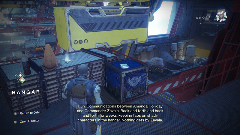 Ghost: "Huh. Communications between Amanda Holliday and Commander Zavala. Back and forth and back and forth for weeks, keeping track on shady characters in the Hangar. Nothing gets past Zavala."
