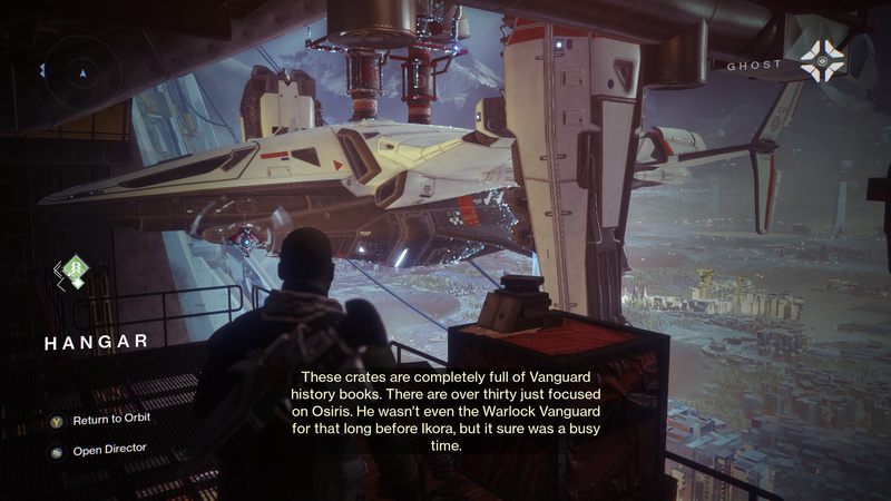 Ghost: "These crates are completely full of Vanguard history books. There are over thirty just focused on Osiris. He wasnt even the Warlock Vanguard for that long before Ikora, but it sure was a busy time."