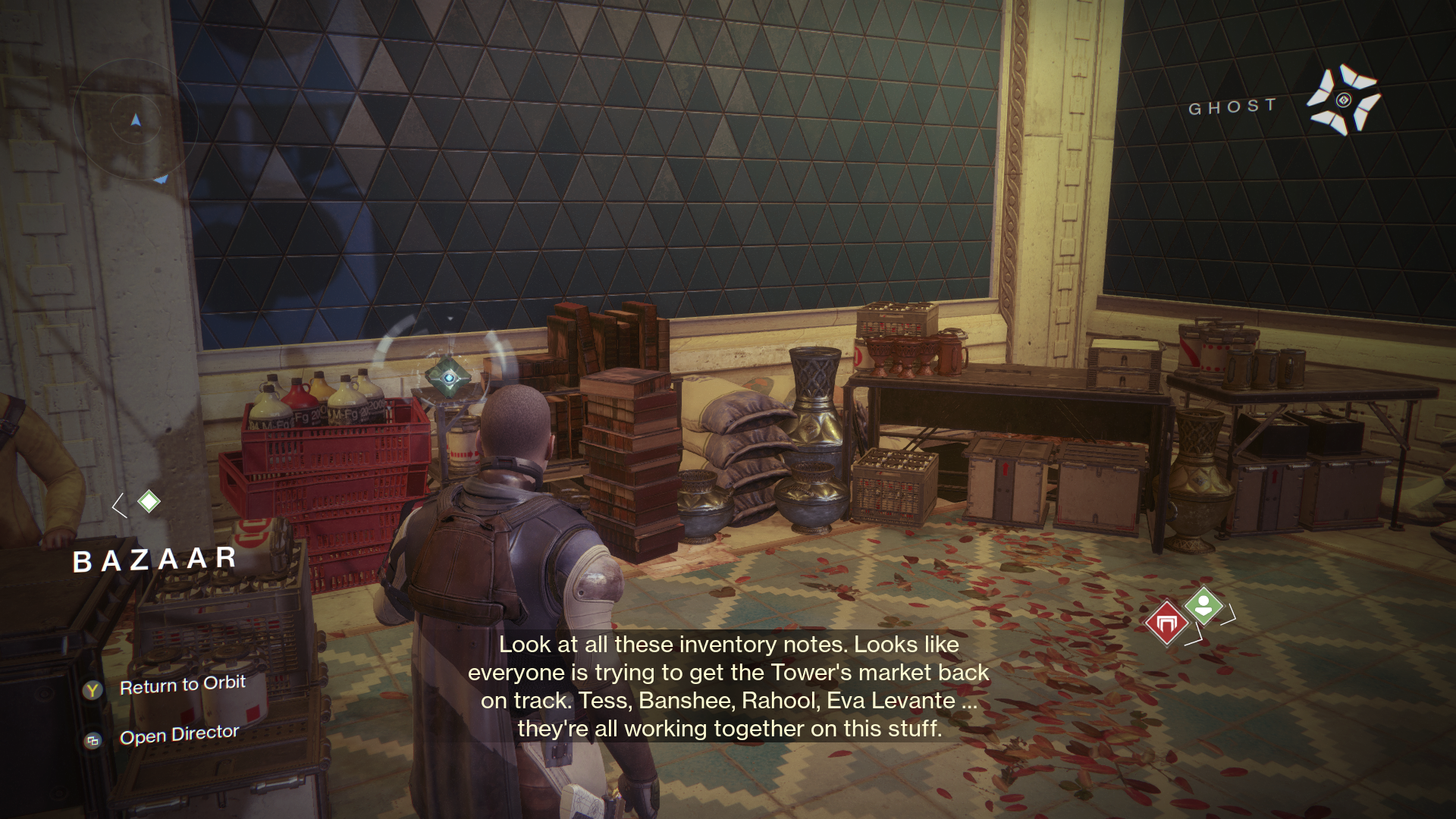 Ghost: "Look at all these inventory notes. Looks like everyone is trying to get the Tower's market back on track. Tess, Banshee, Rahool, Eva Levante ... they're all working together on this stuff."