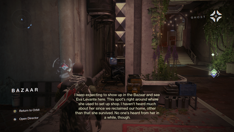 Ghost: "I keep expecting to show up in the Bazaar and see Eva Levante here. This spot's right around where she used to set up shop. I haven't heard much about her since we reclaimed our home, other than that she survived. No one's heard from her in a while, though."