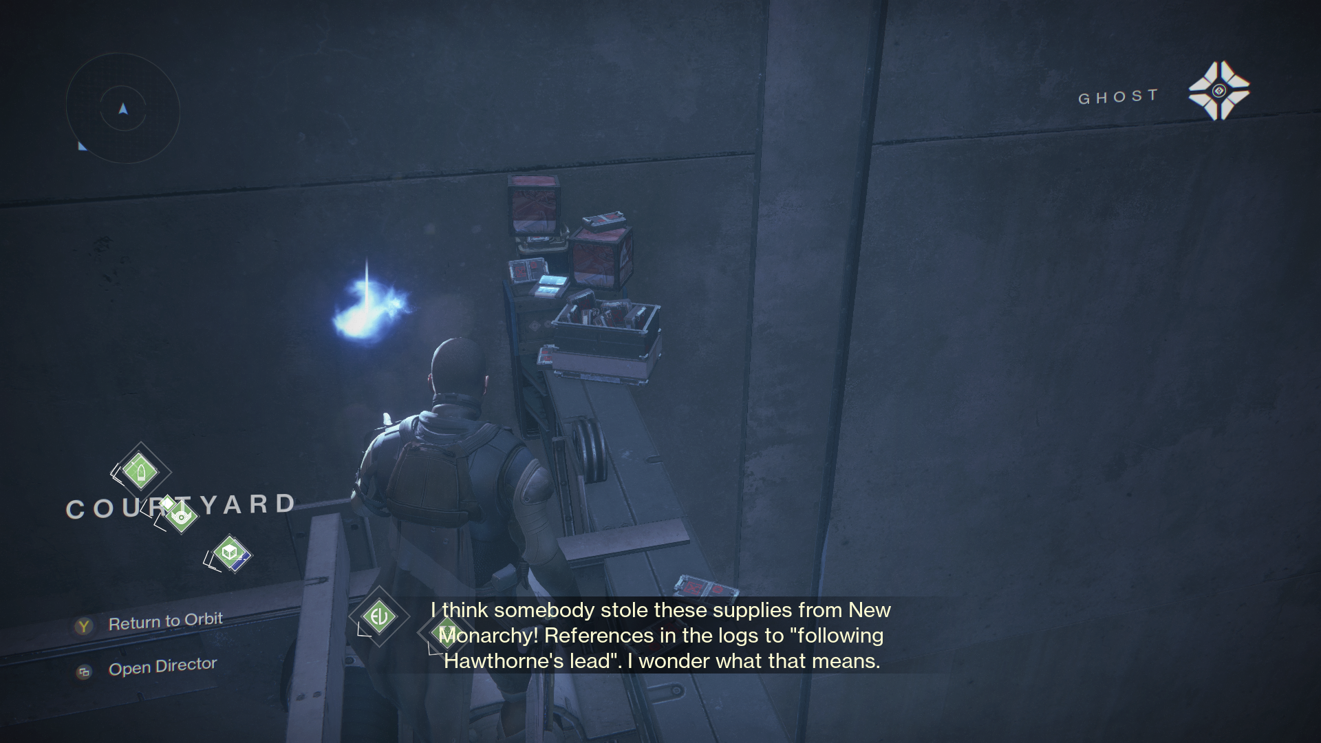 Ghost: "I think someone stole these supplies from New Monarchy! Reference in the logs to 'following Hawthorne's lead'. I wonder what that means."