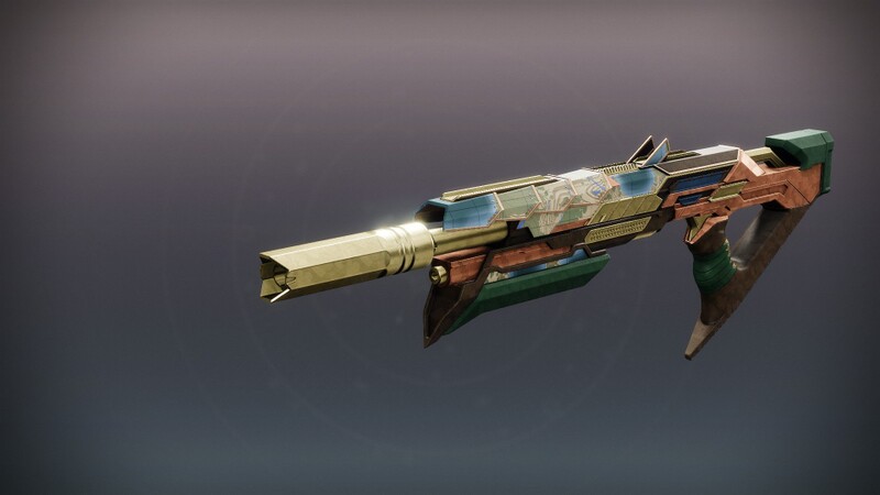 This image is a screenshot of a weapon from the Destiny series of first-person shooter video games developed by Bungie Studios and published by Bungie or Activision. It falls under the screenshot category for a copyrighted computer game or video game, and the copyright for it is most likely held by the company that developed the game. It is believed that the use of a limited number of web-resolution screenshots: