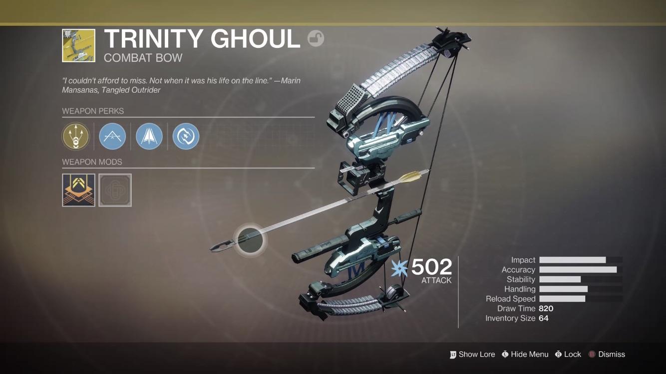 This image is a screenshot of a weapon from the Destiny series of first-person shooter video games developed by Bungie Studios and published by Bungie or Activision. It falls under the screenshot category for a copyrighted computer game or video game, and the copyright for it is most likely held by the company that developed the game. It is believed that the use of a limited number of web-resolution screenshots:
