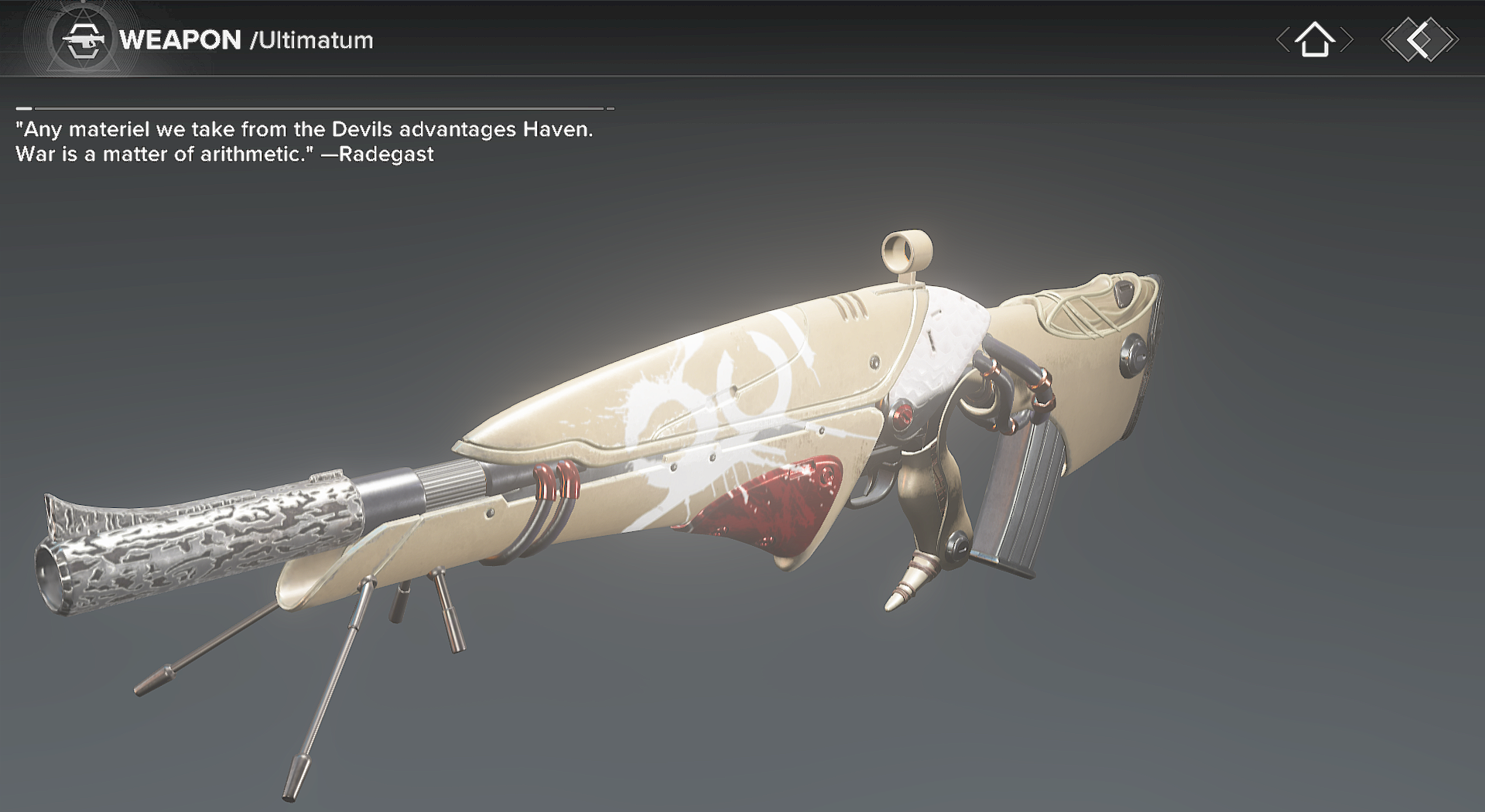 This image is a screenshot of a weapon from the Destiny series of first-person shooter video games developed by Bungie Studios and published by Bungie or Activision. It falls under the screenshot category for a copyrighted computer game or video game, and the copyright for it is most likely held by the company that developed the game. It is believed that the use of a limited number of web-resolution screenshots: