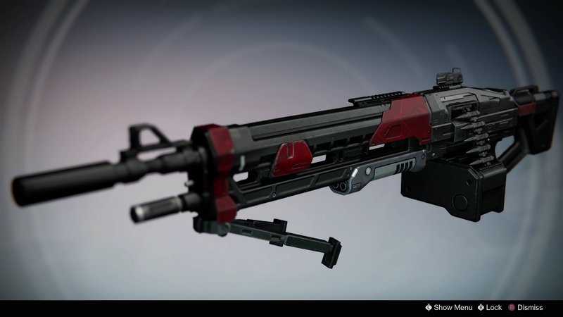 This image is a screenshot of a weapon from the Destiny series of first-person shooter video games developed by Bungie Studios and published by Bungie or Activision. It falls under the screenshot category for a copyrighted computer game or video game, and the copyright for it is most likely held by the company that developed the game. It is believed that the use of a limited number of web-resolution screenshots: