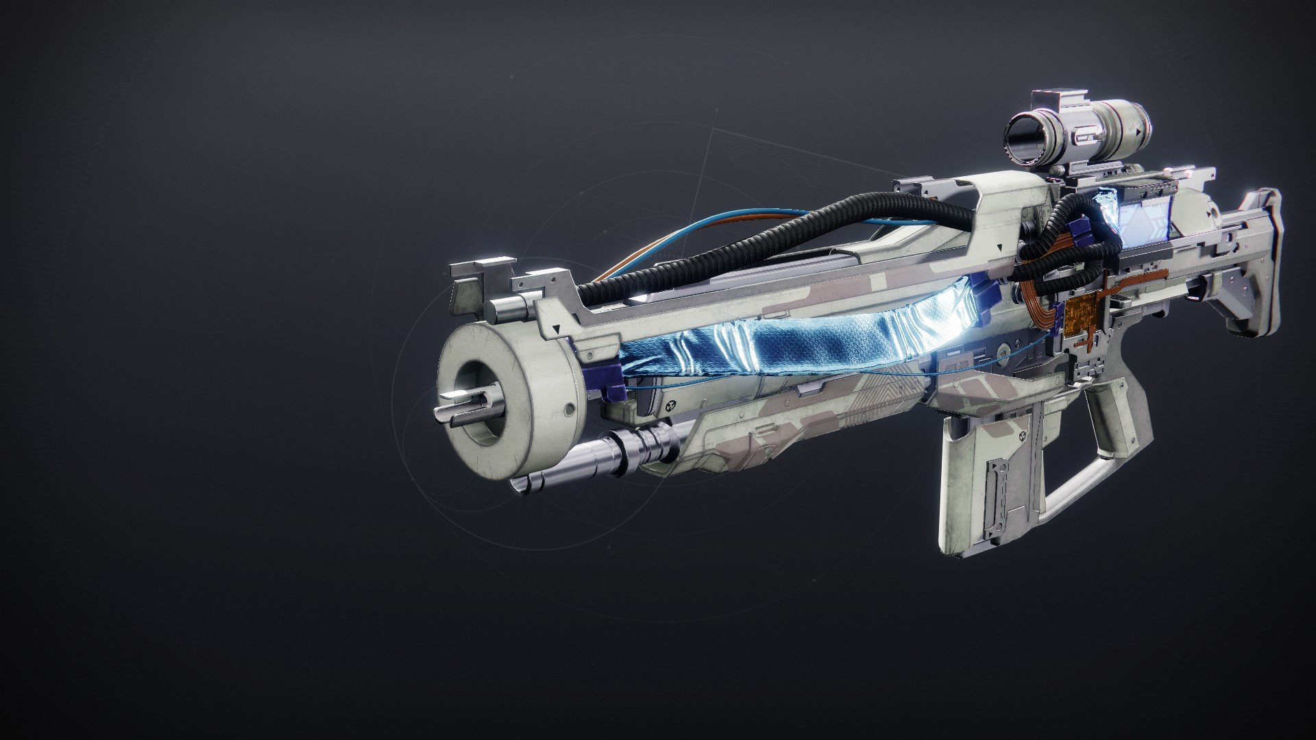 This image is a screenshot of a weapon from the Destiny series of first-person shooter video games developed by Bungie Studios and published by Bungie or Activision. It falls under the screenshot category for a copyrighted computer game or video game, and the copyright for it is most likely held by the company that developed the game. It is believed that the use of a limited number of web-resolution screenshots: