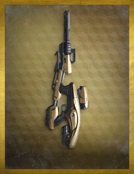 This image is a screenshot of a weapon from the Destiny series of first-person shooter video games developed by Bungie Studios and published by Bungie or Activision. It falls under the screenshot category for a copyrighted computer game or video game, and the copyright for it is most likely held by the company that developed the game. It is believed that the use of a limited number of web-resolution screenshots: